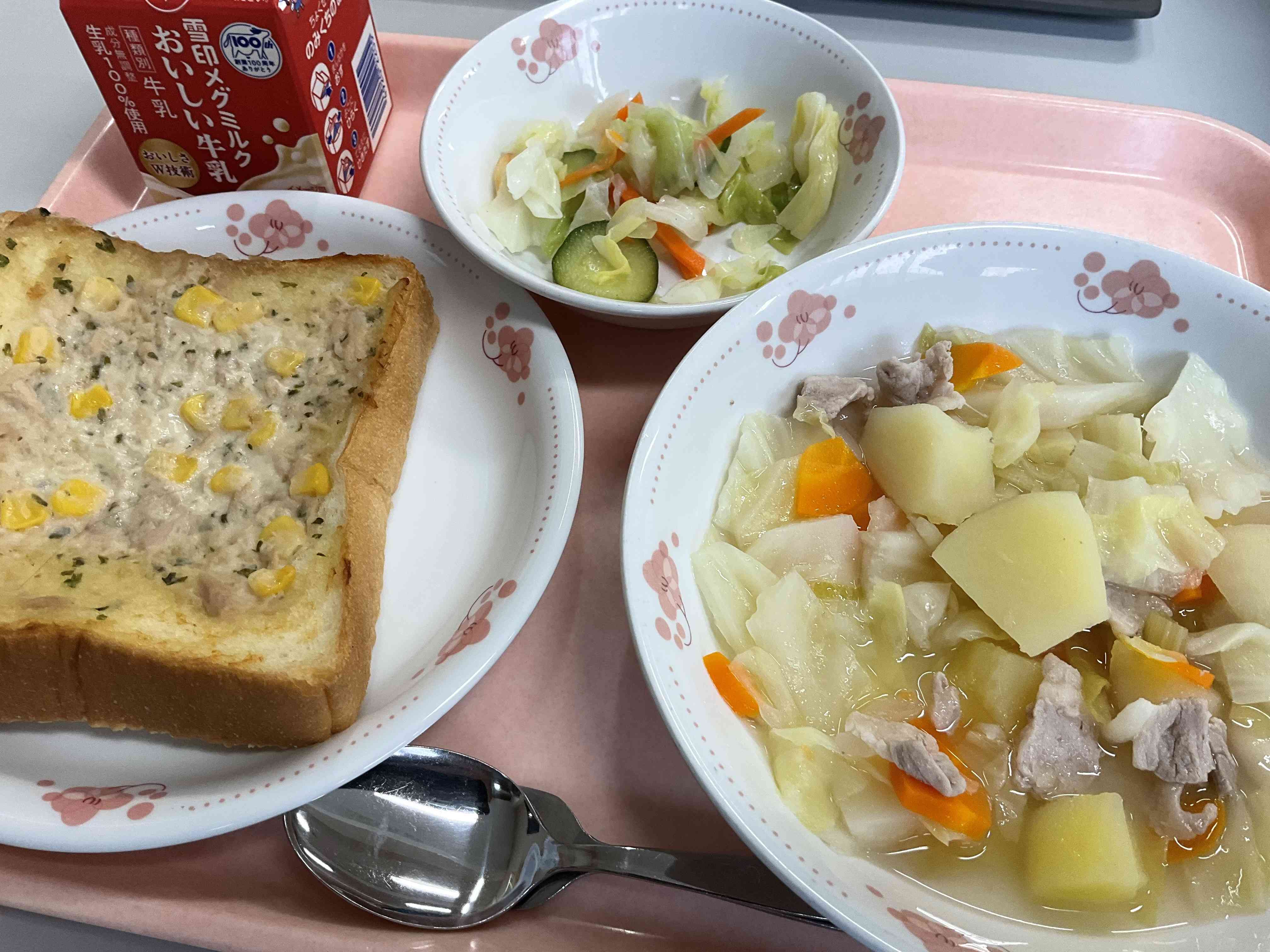 今日の給食 ツナマヨトースト、スープ煮、ゆで野菜、牛乳 今日はスープ煮です! こどもたちから「優しい味!」「お肉が柔らかく、じゃがいもとマッチしておいしい!」という声が聞かれ、温かいスープが大好評でした!