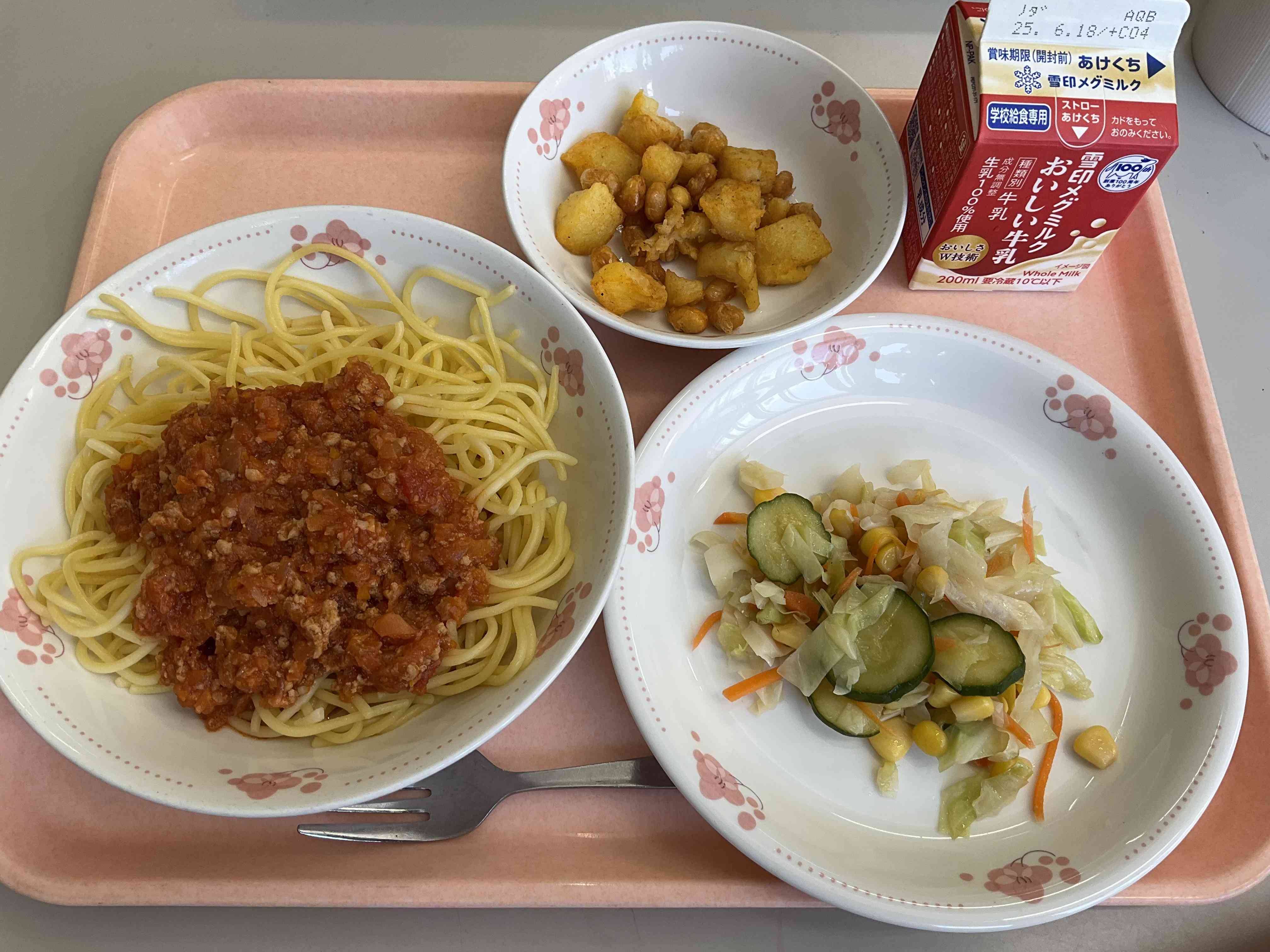 今日の献立 スバゲッティミートソース、ポテトビーンズ、コーン入り茹で野菜、牛乳 今日はスパゲッティミートソースを紹介します!みんな大好きスパゲッティ!というように、こどもたちはミートソースを口のまわりにつけてたくさん食べていました。フォークだけを使ってクルクルと麺を巻き付ける食べ方も上手になってほしいですね!