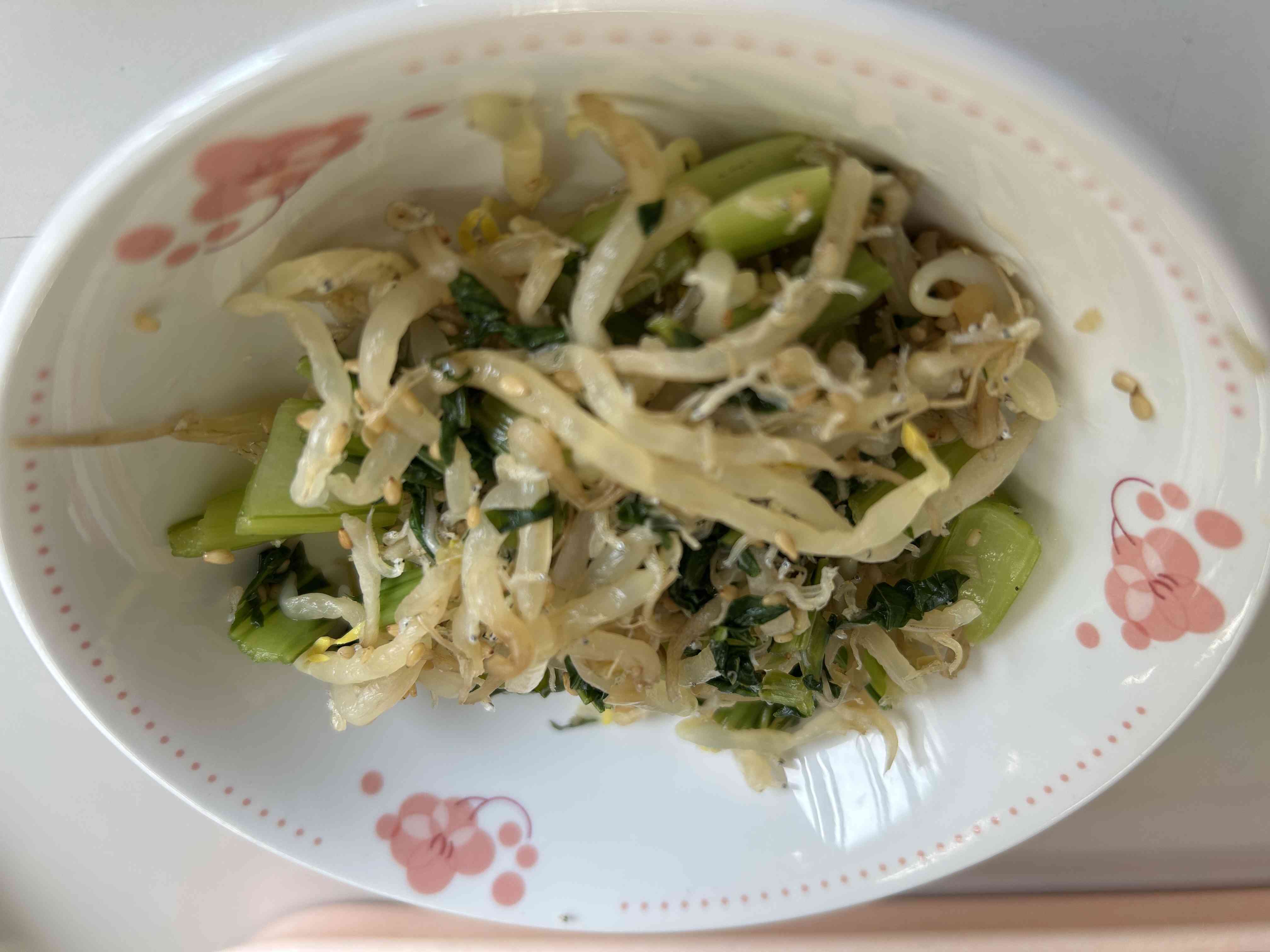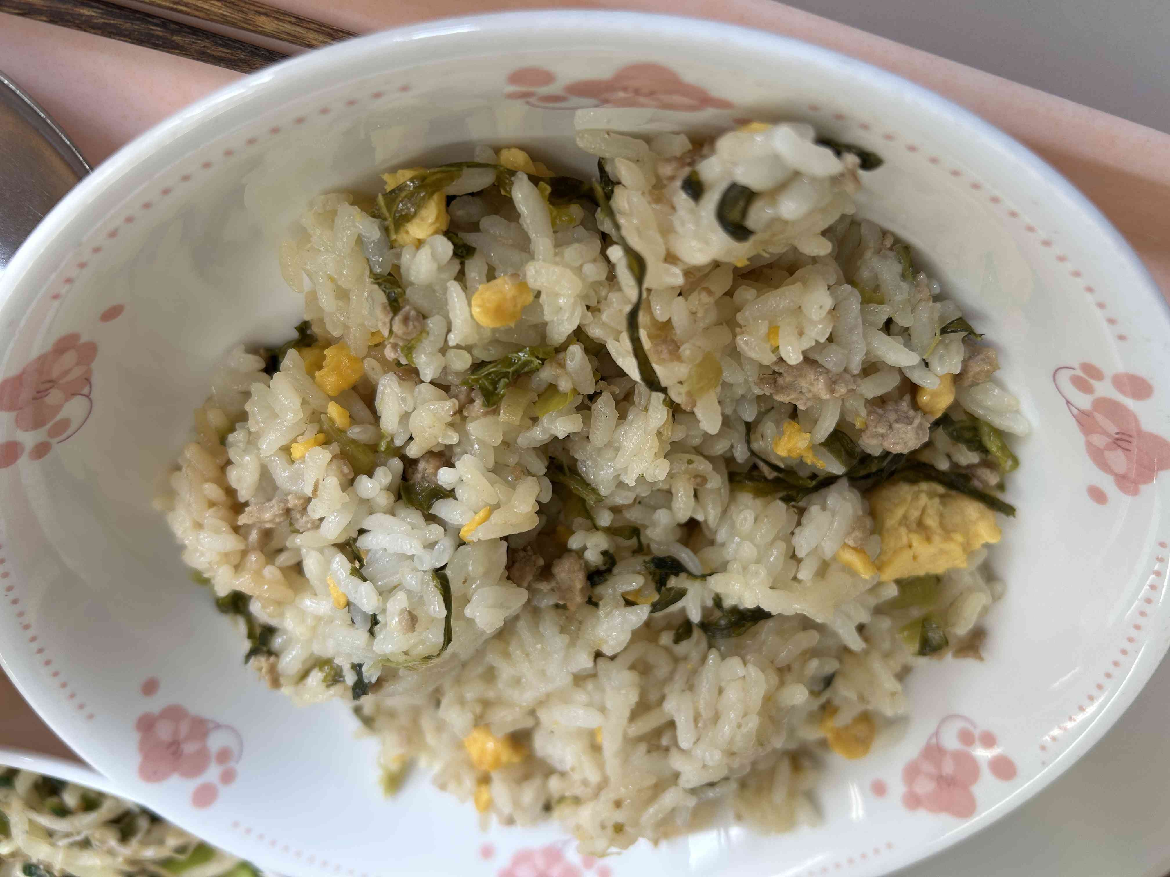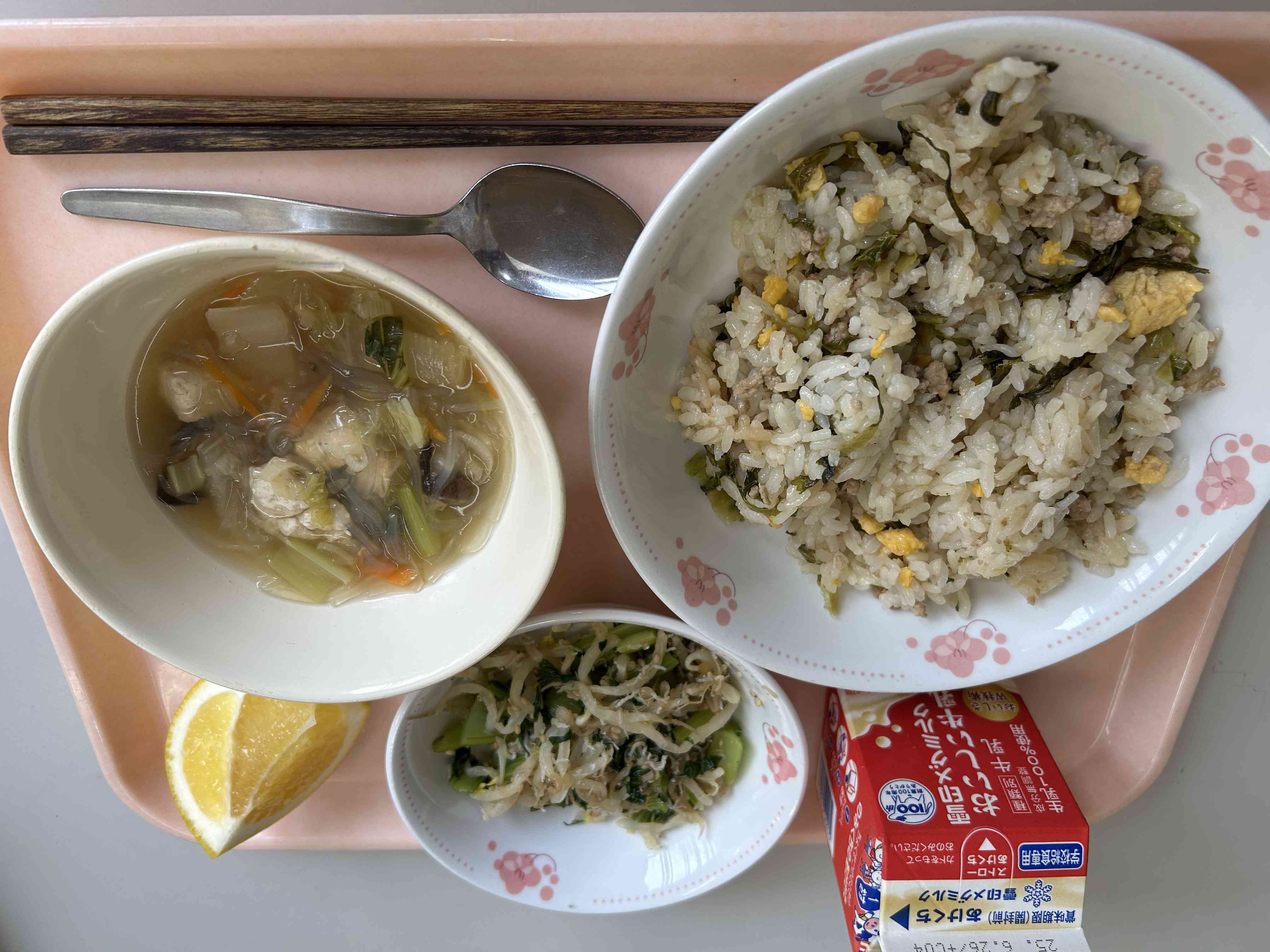 今日の献立 高菜と挽き肉の炒飯、青菜とジャコの茹で野菜、春雨スープ、美生柑 金曜日の給食はボリューム満点炒飯です!今回の炒飯はひき肉がたっぷりと入っており、口の中に入れると高菜のシャキッと感も感じられとても美味しく食べることができました。そしてしっかり味の給食のデザートには美生柑の酸味が強めのさっぱり感がたまりませんでした!