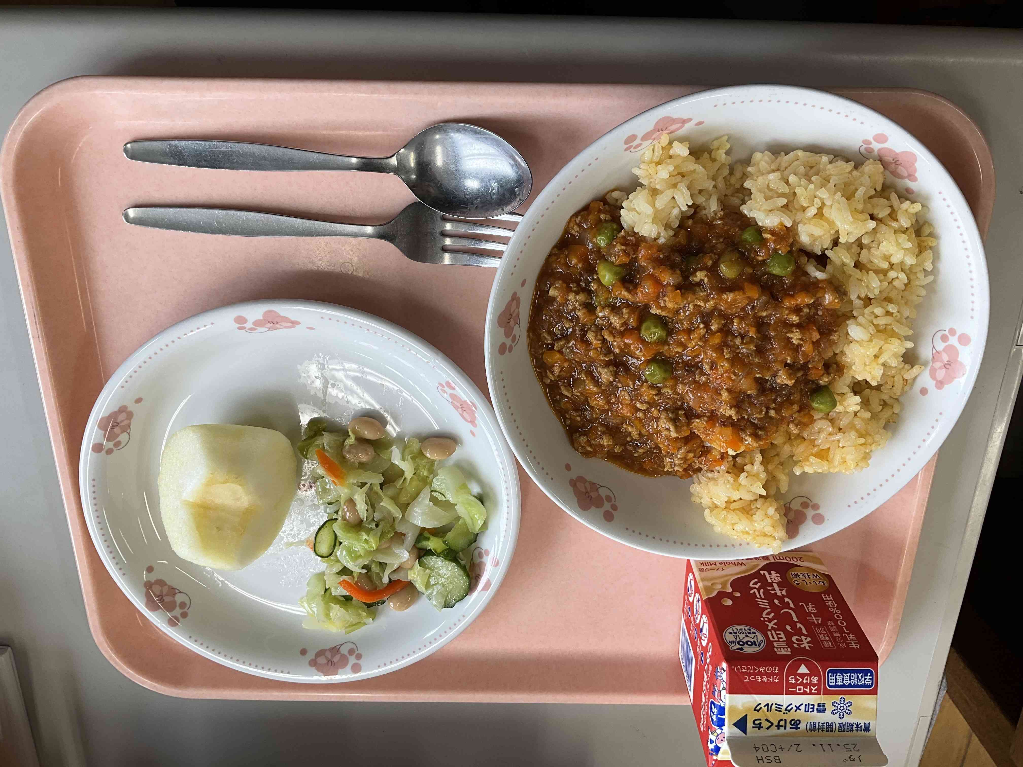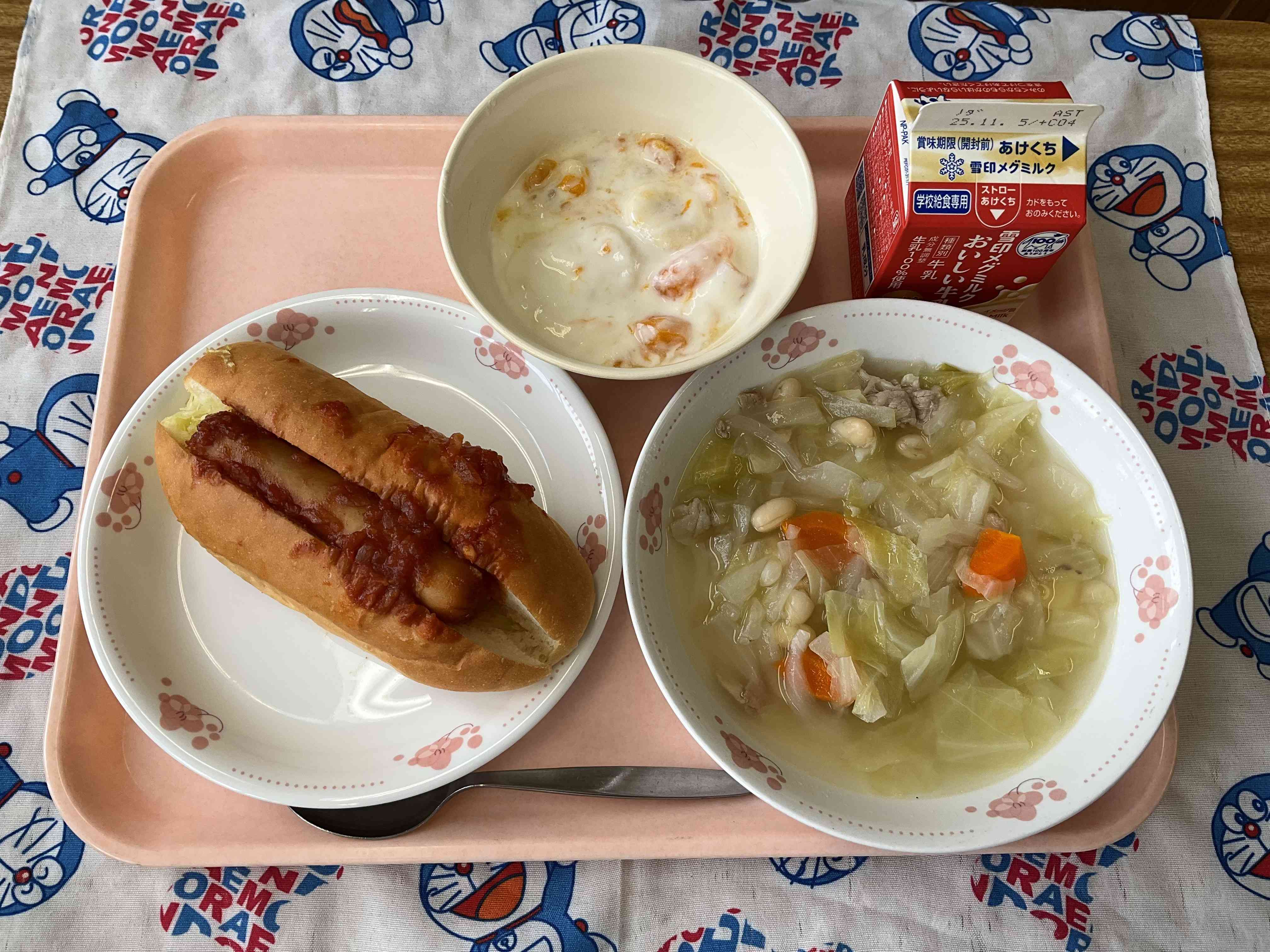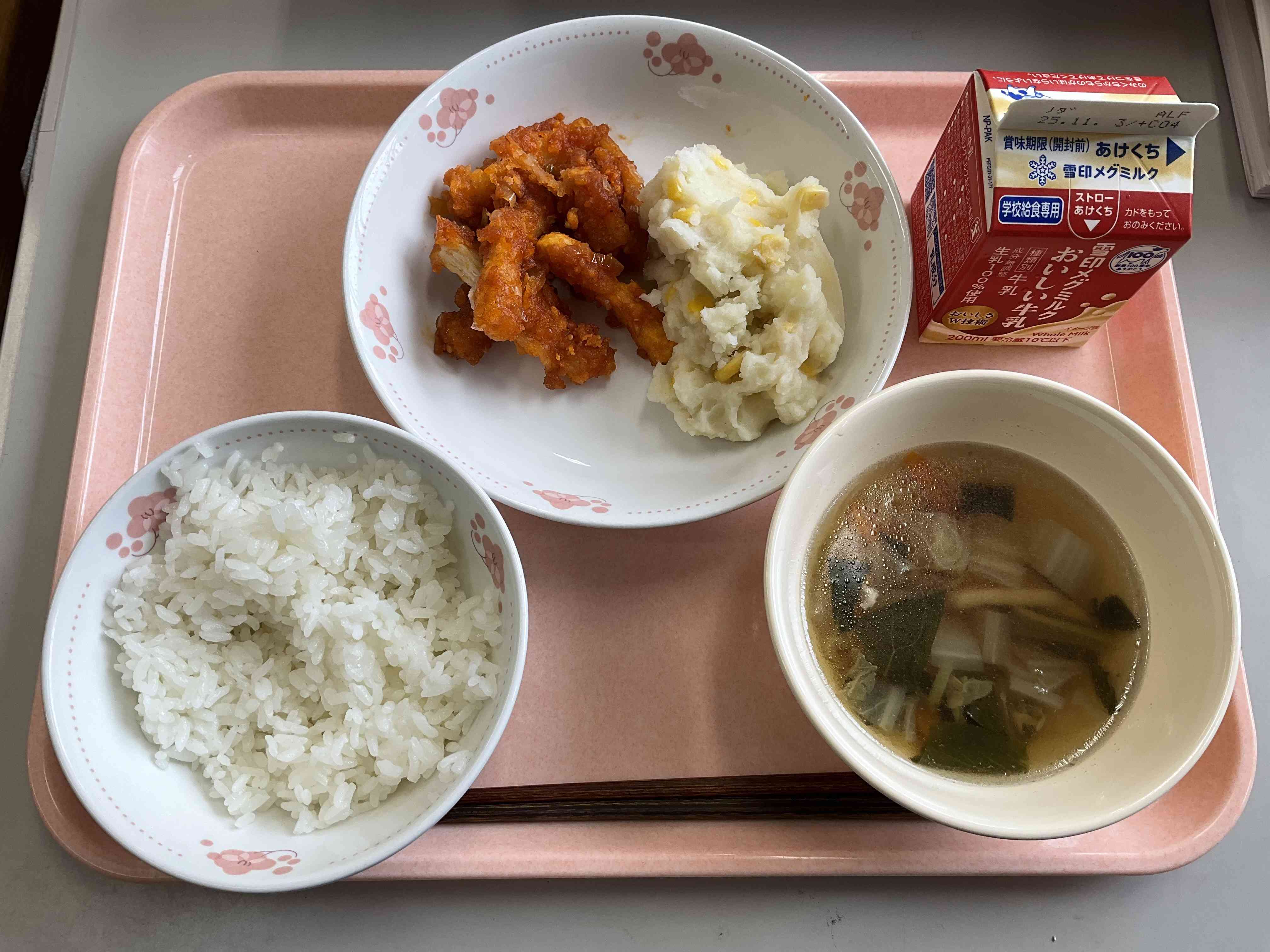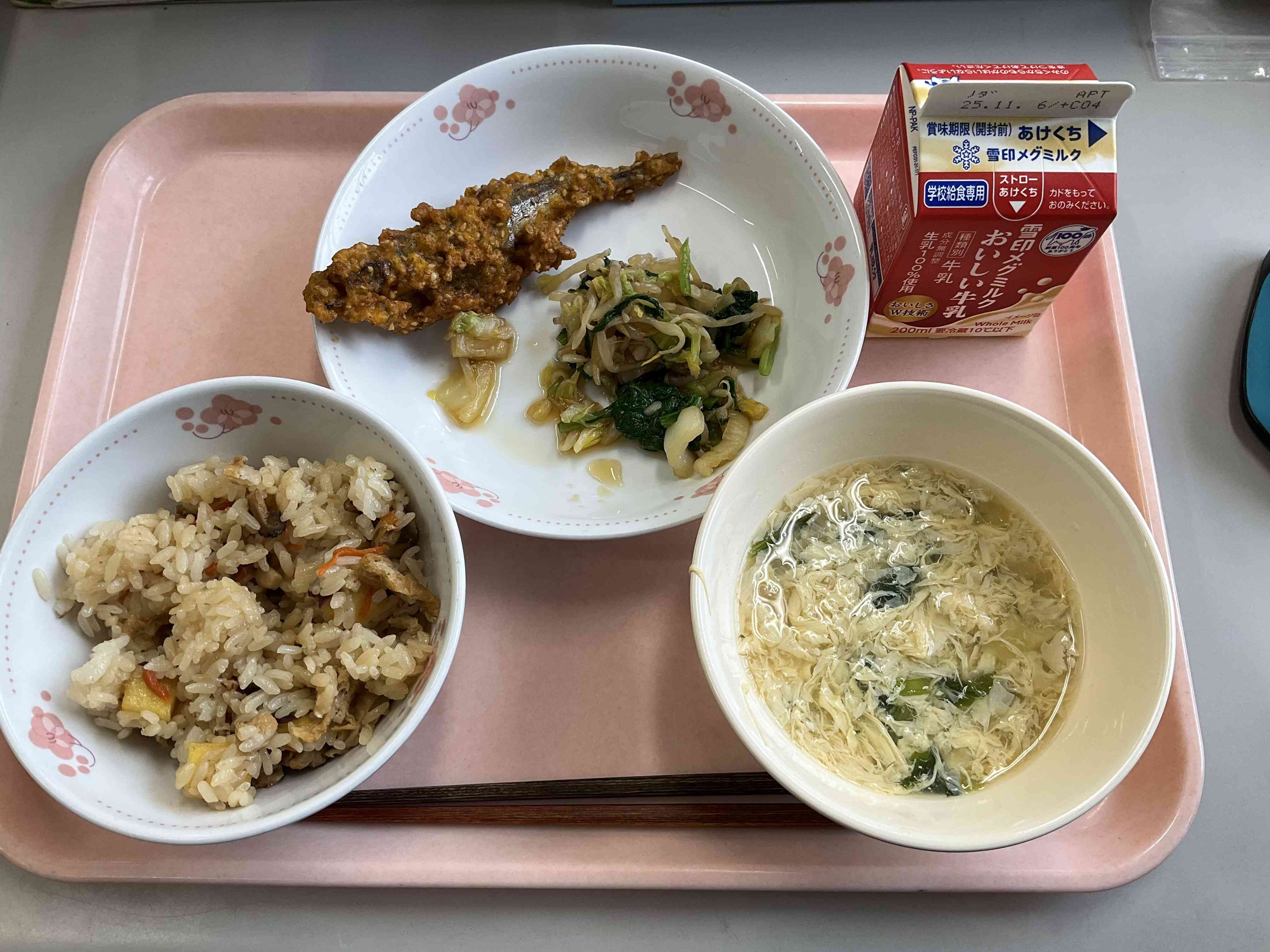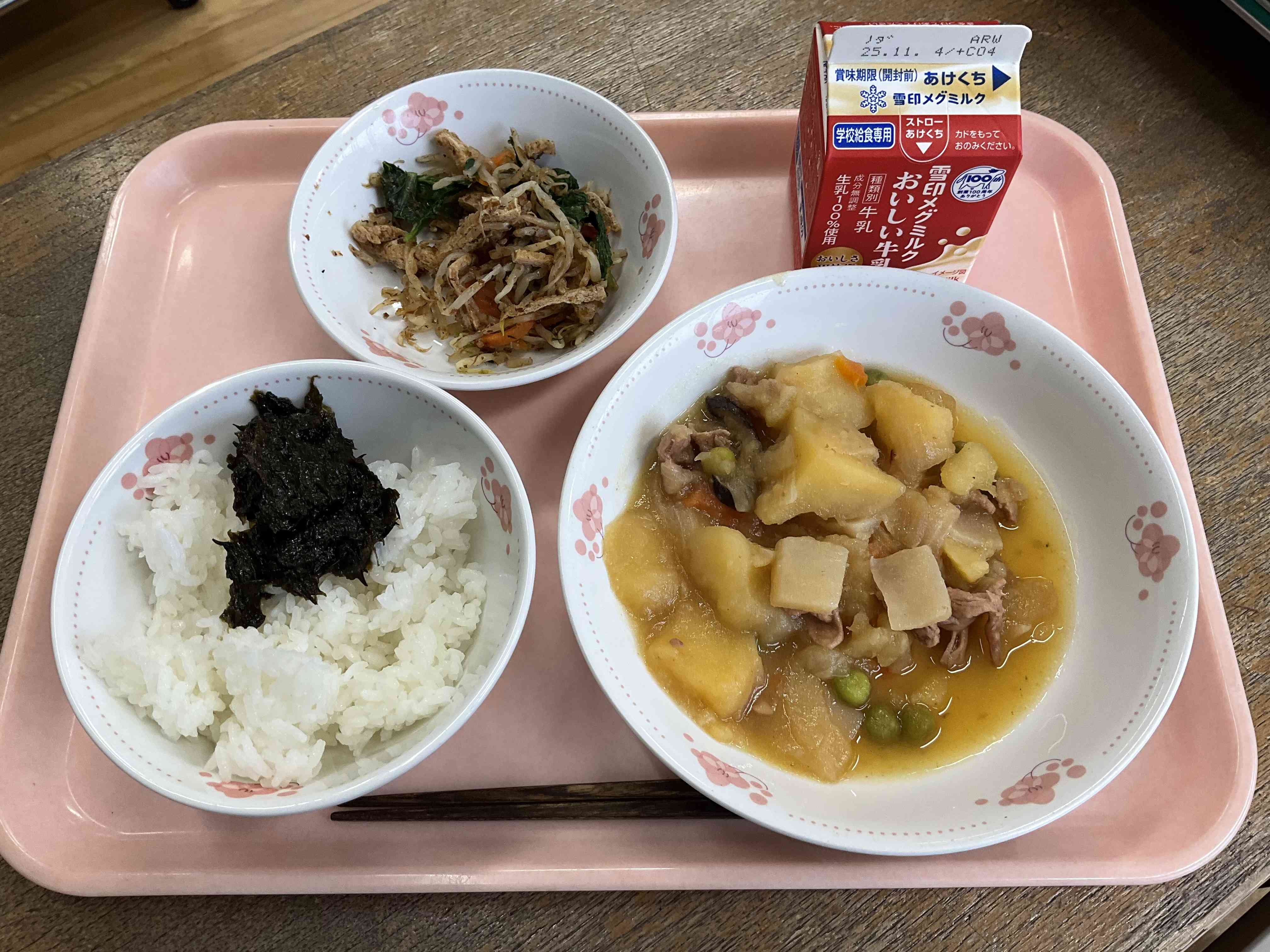 ●10月24日(金)の献立 秋の香りご飯、ししゃもの香味揚げ、ゆで野菜(だし醤油)、かきたま汁、牛乳 ●10月23日(木)の献立 チリドック、インゲン豆入り野菜スープ、フルーツヨーグルト添え、牛乳 今日はスープを紹介します!インゲン豆やキャベツ、ニンジンがたっぷりと入った暖かいスープ。なぜ「インゲン豆」というかご存じですか?気になって調べたところ、日本には江戸時代に中国僧の隠元(いんげん)が持ち込んだため、この名前がついたという説が広く知られているようです。そして、日本で青果として広まったのは明治時代以降であり、現在は日常の食卓で一般的になりました。何気なく食べている野菜の名前の由来を知ることも、食事を楽しむことのひとつですね! ●10月22日(水)の献立 ご飯、ひじき入りの佃煮、肉じゃが、おひたし、牛乳 朝夕の気温が下がってきました。10度台前半とどんどん冬に近づいていますね。そんな肌寒い日には、温かい肉じゃがです!具を柔らかく煮てあり、ホッとできるおいしさでした! ●10月21日(火)の献立 ご飯、イカのチリソース、マッシュポテト、中華スープ、牛乳 火曜日はイカのチリソースを紹介します!イカをサクッと揚げてから、チリソースをたっぷりとからめました。そして、もうひとつのおかずに、マッシュポテトが提供されました。ジャガイモのなめらかな食感にとうもろこしのつぶつぶ感がぴったり!「う〜ん・・・うまい!」と味わって食べていた児童もいました。 ●10月20日(月)の献立 ドライカレー、大豆入りゆで野菜、りんご、牛乳 1週間の始まりの給食はドライカレーです!午前の授業中から、校内にカレーを調理するいい香りが漂っていました。こどもたちからは「いい匂いがする〜!」「今日カレーだよ!ヤッタね!」というような声が聞かれました。6年生は連合運動会で、午後から競技がありました。カレーを食べてファイト一発!【添付ファイル】