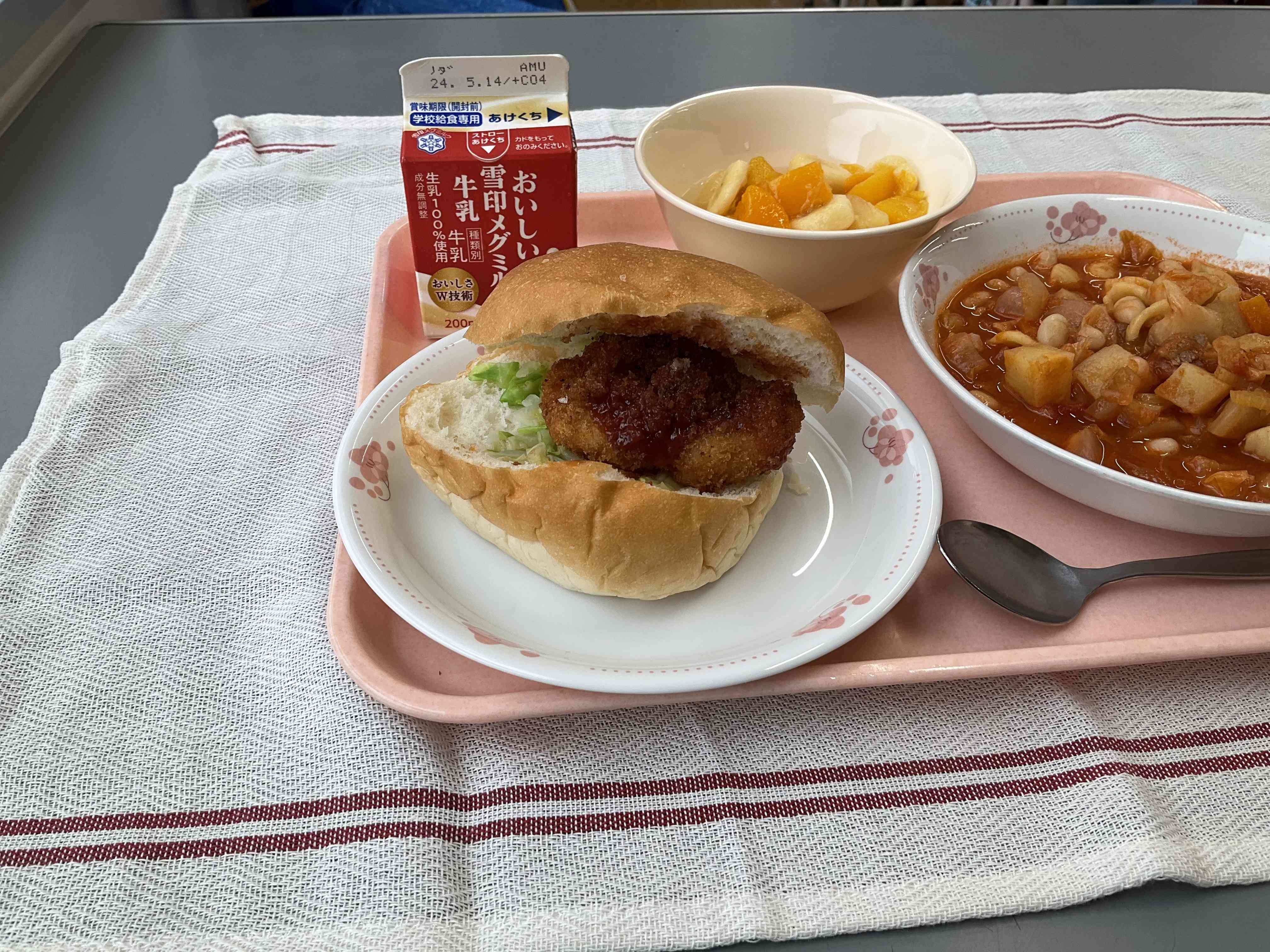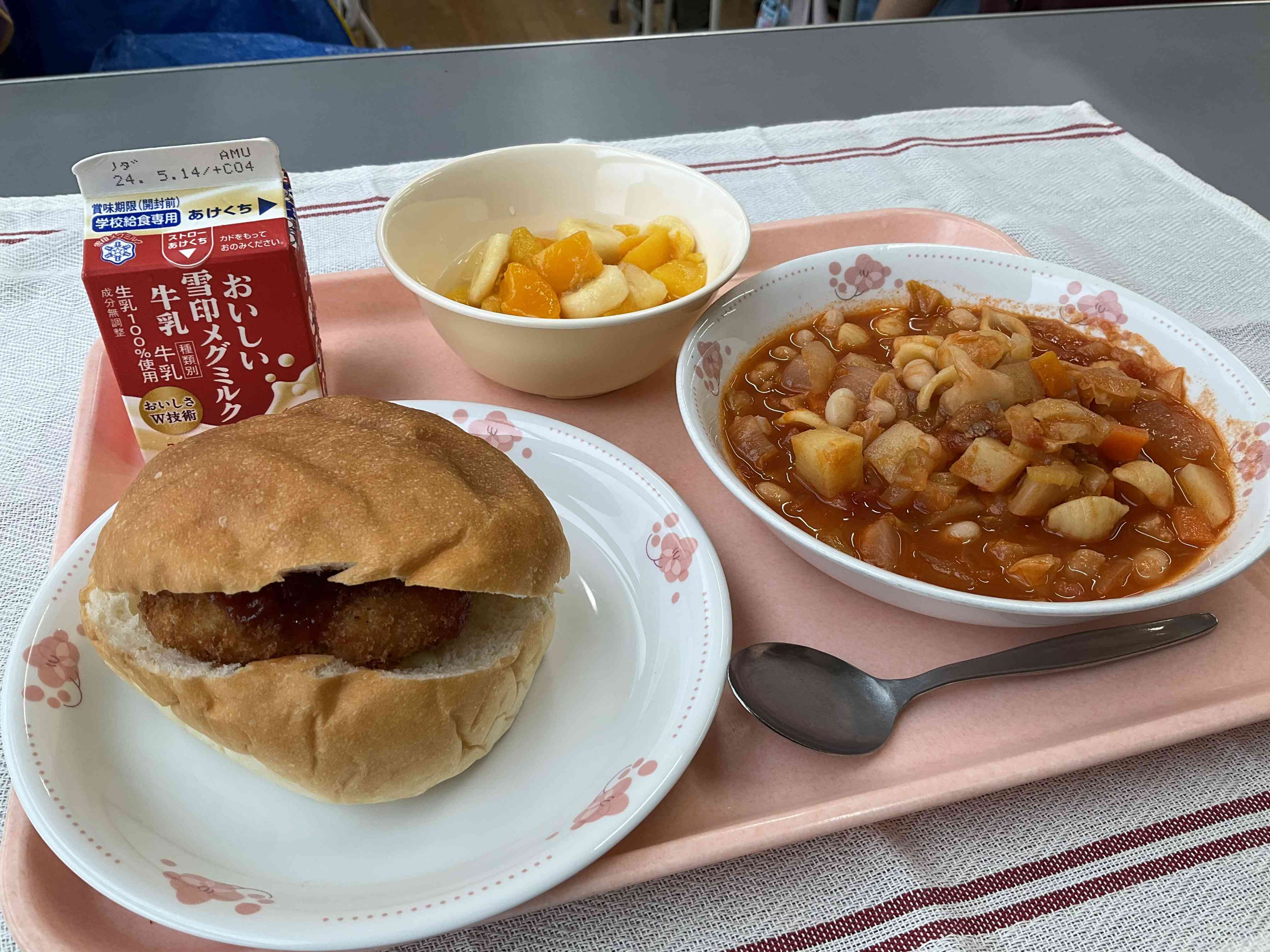 〇今日の給食 フィッシュバーガー、ミネストローネスープ、フルーツポンチ、牛乳 今日はフィッシュバーガーです!サクサクの魚のフライとキャベツがパンにサンドされていました。 さて・・今日のフィッシュフライですが、なんという魚が使われているのでしょうか? スーパーでは見かけない「メルルーサ」という魚です。白身魚で、食感はタラに似ていました。 スープのミネストローネのほどよい酸味と合わさって、平久バーガーセットの完成です!【添付ファイル】