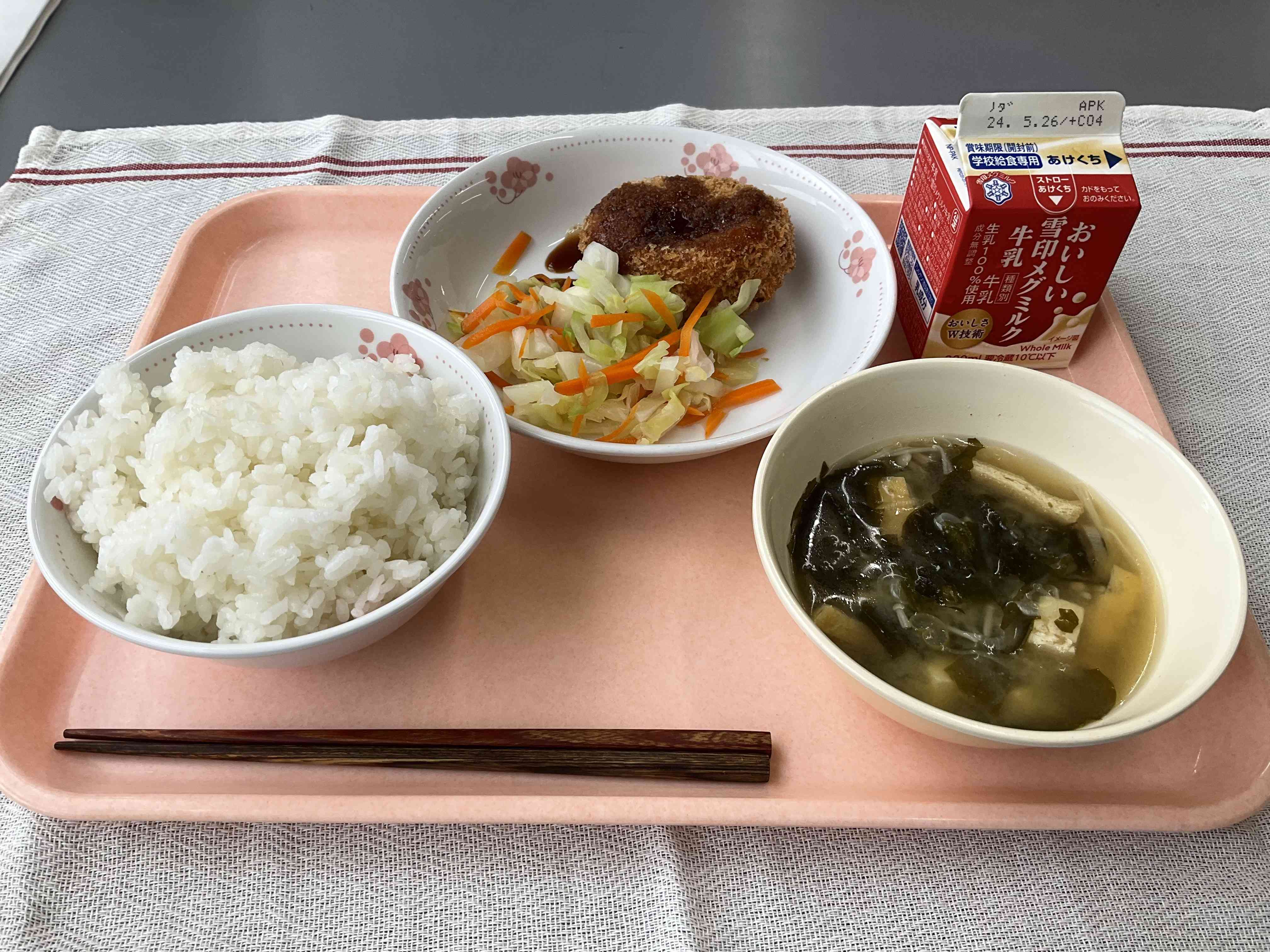 〇今日の献立 ご飯、コロッケ、茹でキャベツ、味噌汁(豆腐、わかめ) 今日のコロッケは大きめのサイズでボリューム満点でした。マッシュポテトと、ゴロゴロとしたポテトの食感もよく、ご飯がすすむおかずでした。そして、茹でキャベツは、ドレッシングなどはかけずに提供しましたが、子どもたちからは意外な感想が聞かれました。食べ始めると「今日の野菜、味がしなくない?」という意見が聞かれましたが、「でもみずみずしくて、いつもより野菜の味がするじゃん!」という感想です。それに対して他の子どもたちも、「野菜の味って結構薄いんだね!」と感想を話していました。いろいろな調味料で食べやすい料理が多いですが、シンプルな調理方法で、素材の味を食べて学ぶのも給食ですね!子どもたちすごい!!!【添付ファイル】