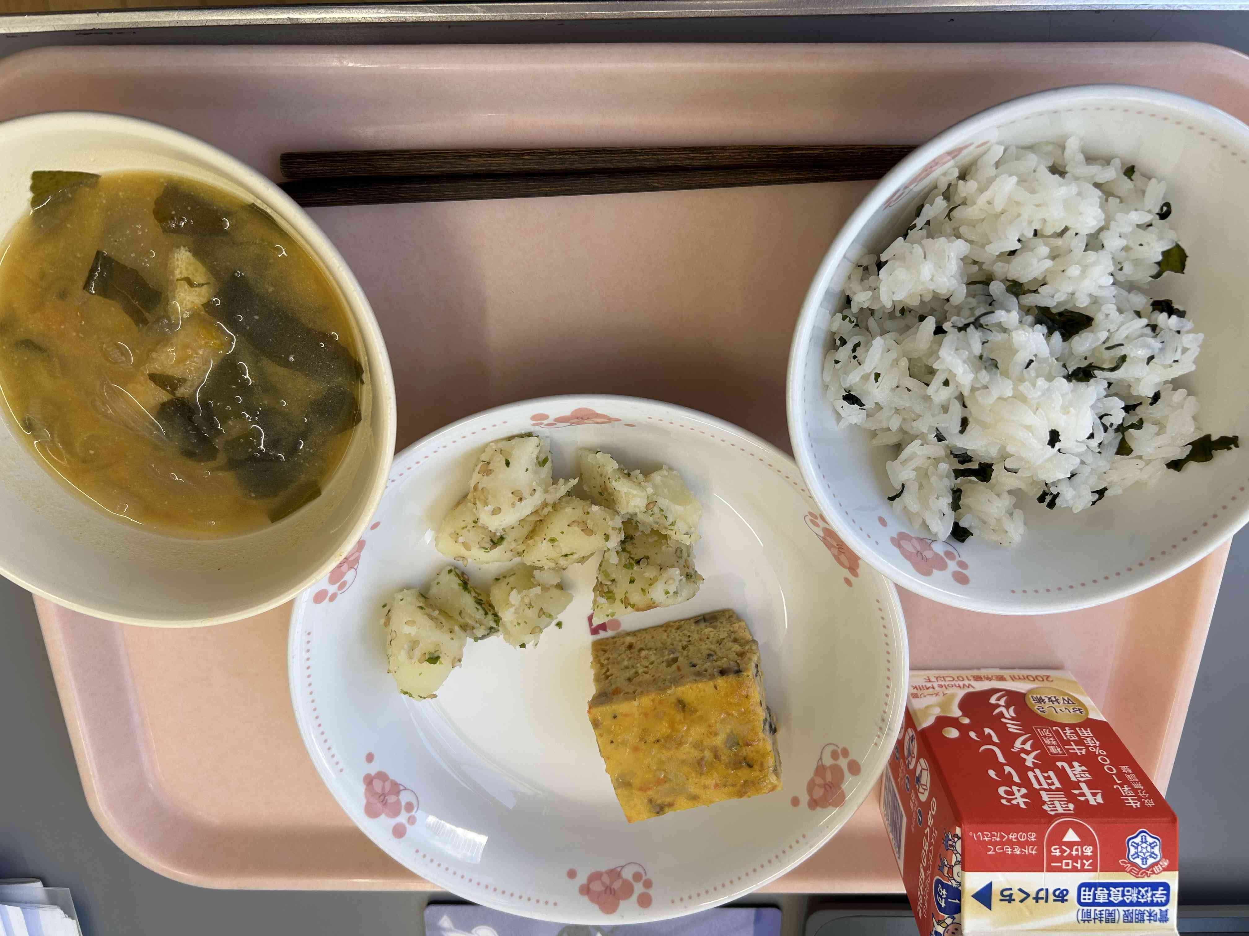 今日の献立 わかめご飯、さらさ焼きあんかけ、じゃがいもの香味和え、かぼちゃのみそ汁。牛乳 今日はさらさ焼きです!彩り豊かな食材を卵と一緒に焼いた料理をさらさ焼きといいます。 さらさ(更紗)とは、染模様のことをいい、その彩りや鮮やかさを料理名に取り入れたのが「さらさ焼き」です。 見た目も味も上品な一品ですね!
