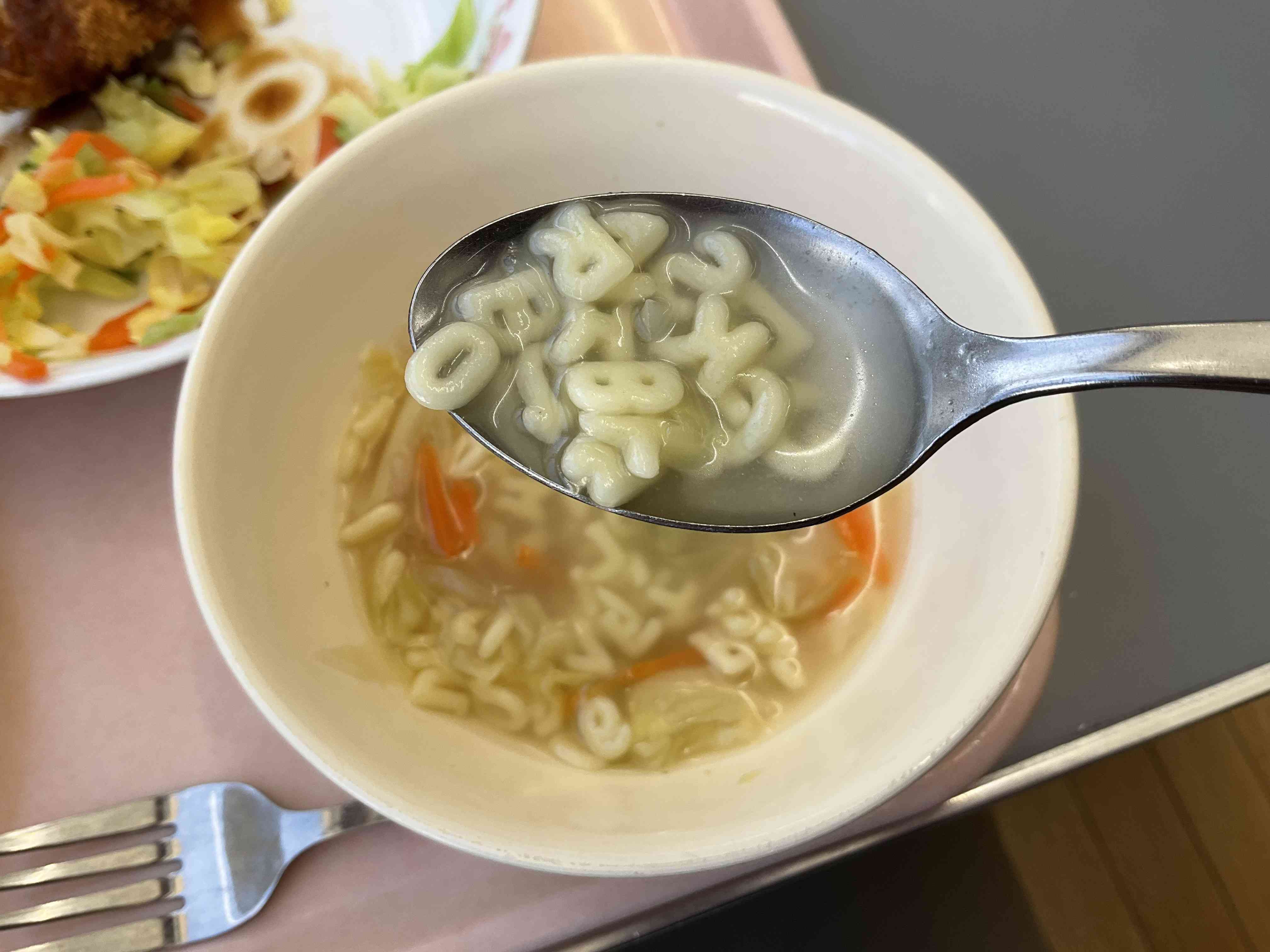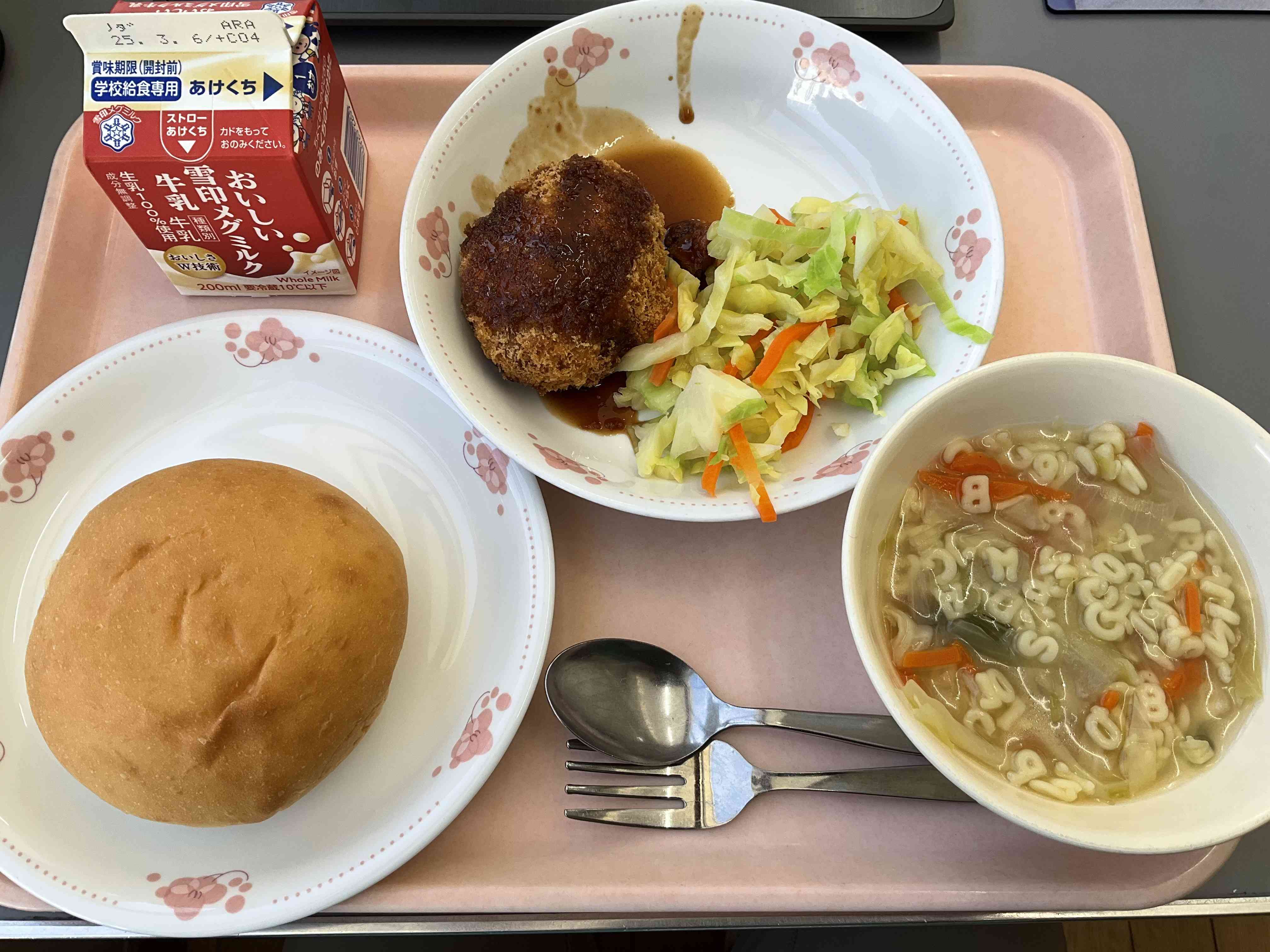 今日の献立 丸パン、ビーンズコロッケ、茹でキャベツ、ABCスープ、牛乳 金曜日の給食はパンです。今日の丸パンはしっかりとした食感で噛み応えがるおいしいパンでした。子どもたちの中には、パンの間にコロッケをはさんで食べている様子も見られました。そして、ABCスープには、アルファベット型のパスタがたっぷりと入っていました。見ても楽しめるおいしい給食です!