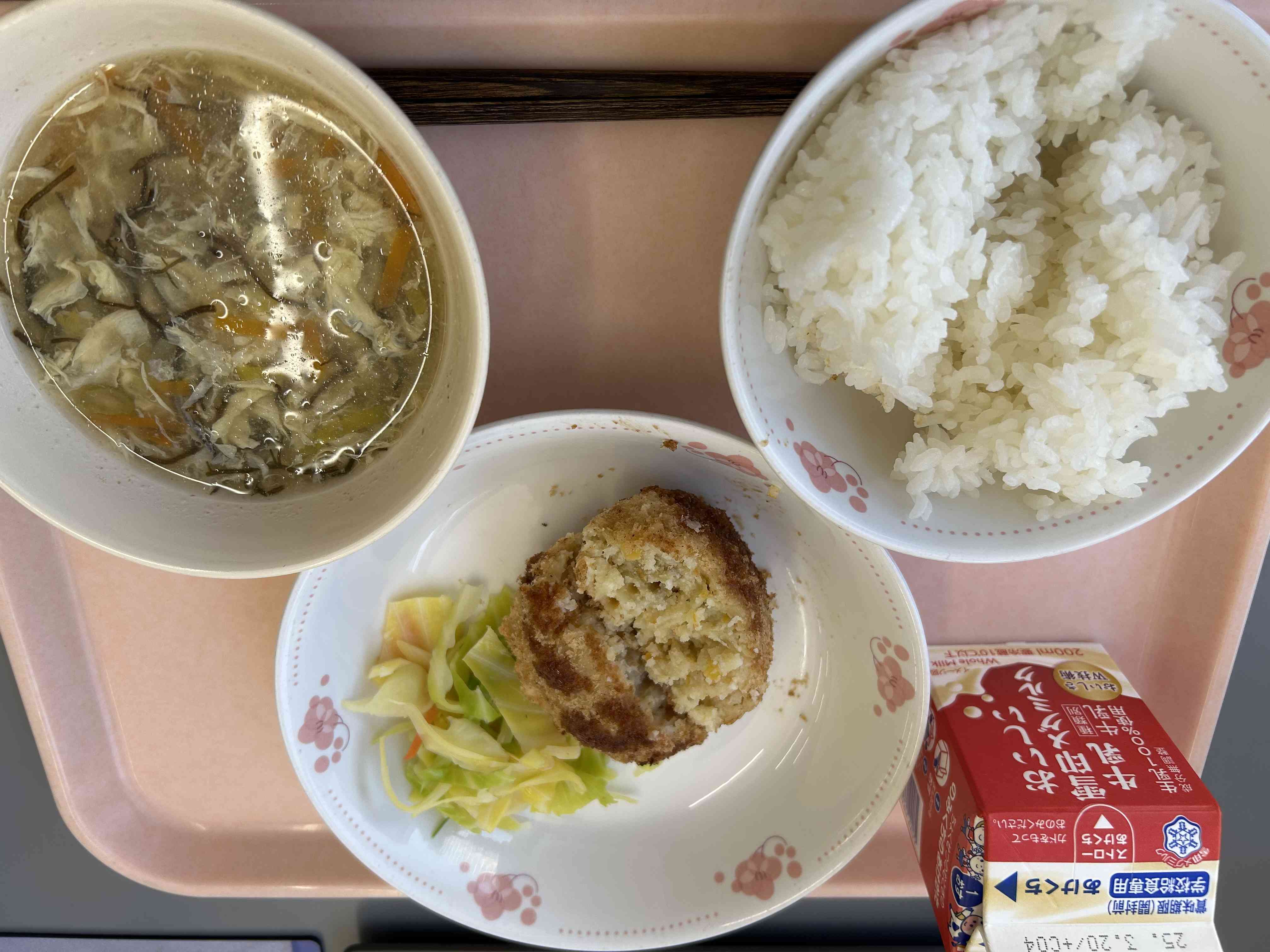 ご飯、コロッケ(おから・レンズ豆)、ゆでキャベツ、もずくスープ、牛乳 給食当番が食缶を開けた時に「うわぁ~!」という献立。・・・それはコロッケです!今日のコロッケは、子どもたちの握りこぶしくらいの大きさでした。おからを入れているので、しっとりとした食感の中に、豆や野菜のつぶつぶ感が生きていました。そして、もずくスープは鶏ガラと鰹節の優しい味わいに、卵のまろやかさが加わって、これまた人気メニューでした。そんな人気メニューたちに負けないように、子どもたちからやや冷たい視線で見られていたゆで野菜もたくさん食べてもらおうと、野菜のおいしさアピールをする担任でした!【添付ファイル】