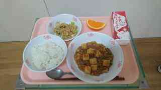 牛乳 ご飯 麻婆豆腐 じゃこ入りナムル 清見オレンジ