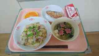 牛乳 花見寿司 サワラの竜田揚げ かまぼこ入りすまし汁 清見オレンジ