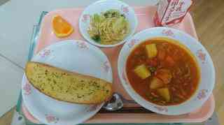 牛乳 ガーリックトースト ポークビーンズ キャロットドレッシングサラダ 清見オレンジ
